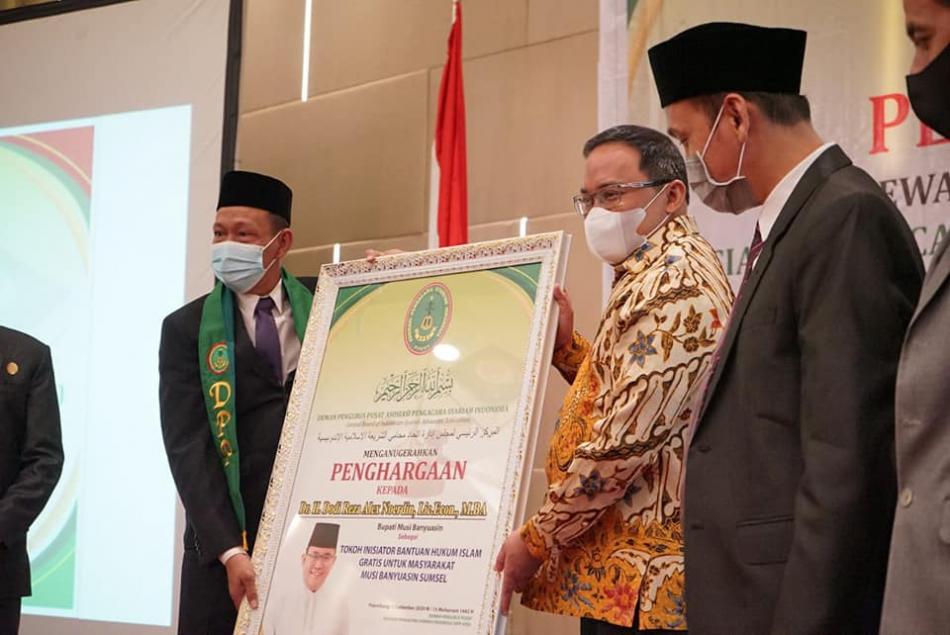 "Dengan indikator tersebut dan berdasarkan fakta-fakta empiris, dengan ini Dewan Pengurus Pusat Asosiasi Pengacara Syariah Indonesia (APSI) menganugerahkan penghargaan kepada Bupati Muba Dr Dodi Reza Alex Noerdin Lic Econ MBA sebagai Tokoh Inisiator Bantuan Hukum Islam Gratis untuk masyarakat Muba-Sumsel," ungkap Ketua Umum APSI Dr Sutrisno SAg MH di sela Pelantikan Dewan Pengurus Wilayah Asosiasi Pengacara Syariah Indonesia (DPW APSI) Sumatera Selatan Periode 2020-2025 di Hotel The Alts Palembang, Kamis (3/9/2020).