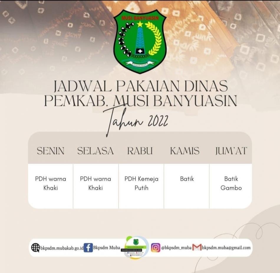 "Kita ingin menyesuaikan dengan aturan Mendagri. Jadi untuk jadwalnya yakni Senin mengenakan PDH Warna Kaki, Selasa PDH Warna Khaki, Rabu PDH Kemeja Putih, Kamis Batik, Jumat Batik Gambo," ungkap Plt Bupati Beni Hernedi SIP.
